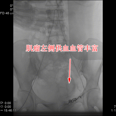 △術前造影可見肌瘤左右側的供血豐富。