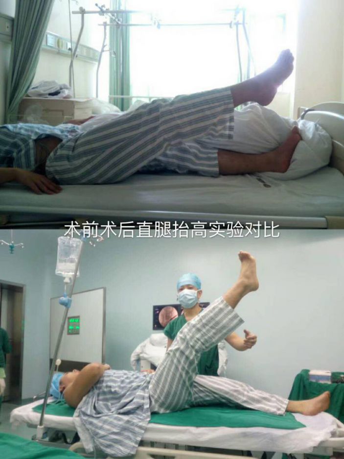 3月28日,我院外四科吳志斌主任帶領團隊爲其實施經側路鏡L4/5椎間盤髓核摘除術。通過摘除突出髓核,解除對神經根的壓迫,達到根治目的。術後患者疼痛消失,直腿擡高試驗85度(-),手術非常成功。