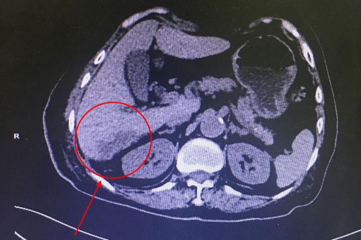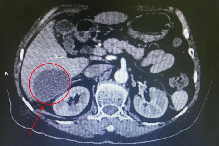 經CT檢查發現患者肝右葉S5、S6、S7段多發膿腫,病竈最大的達6.0*4.2cm,結腸肝曲周圍炎性滲出。據了解,肝膿腫是肝髒化膿性病變,若不積極治療,死亡率達10%-30%。